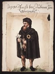 Cabezas de ajo, una bolsa con dinero y el distintivo amarillo como las insignias de un judío de la época del renacimiento de la ciudad de Worms (Wiki Commons: Thesaurus Picturarum of Marcus zum Lamm, 3 de Marzo 1544 – 13 de febrero 1606.)